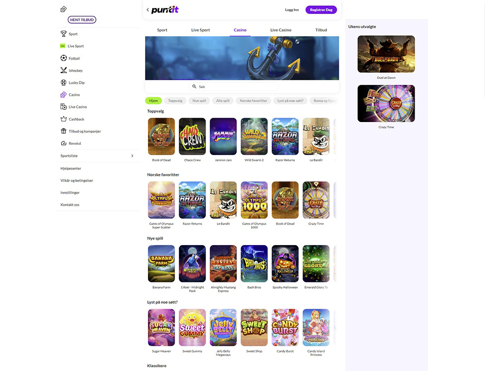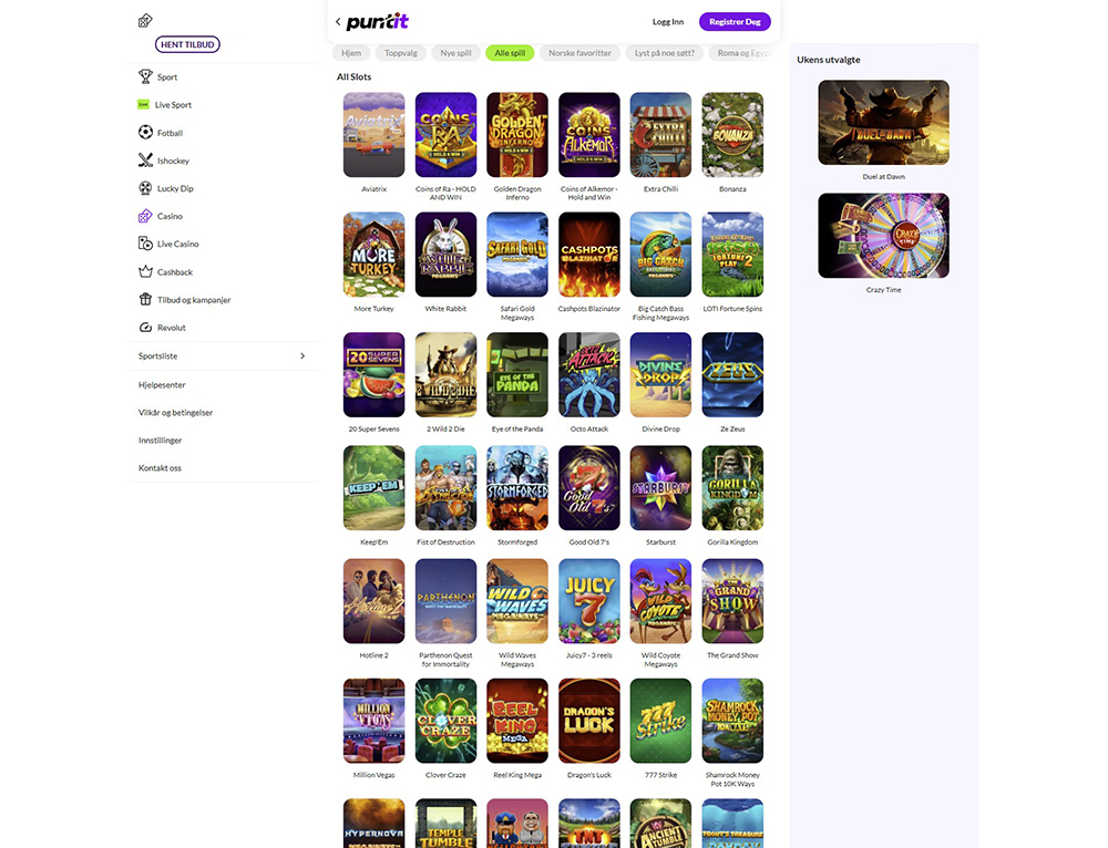 Når du besøker Puntit for første gang og skal i gang med å spille, vil du merke at nettsiden er enkel og oversiktlig. Helt til venstre i menyen finner du de ulike kategoriene, som både dekker casino og sport. De mest populære kategoriene er samlet midt på siden, og det er enkelt å trykke seg inn på riktig kategori. Søkefunksjonen er synlig rett over der man kan filtrere etter casinospill, og du kan enkelt filtrere etter toppvalg, nye spill, norske favoritter og en rekke andre.