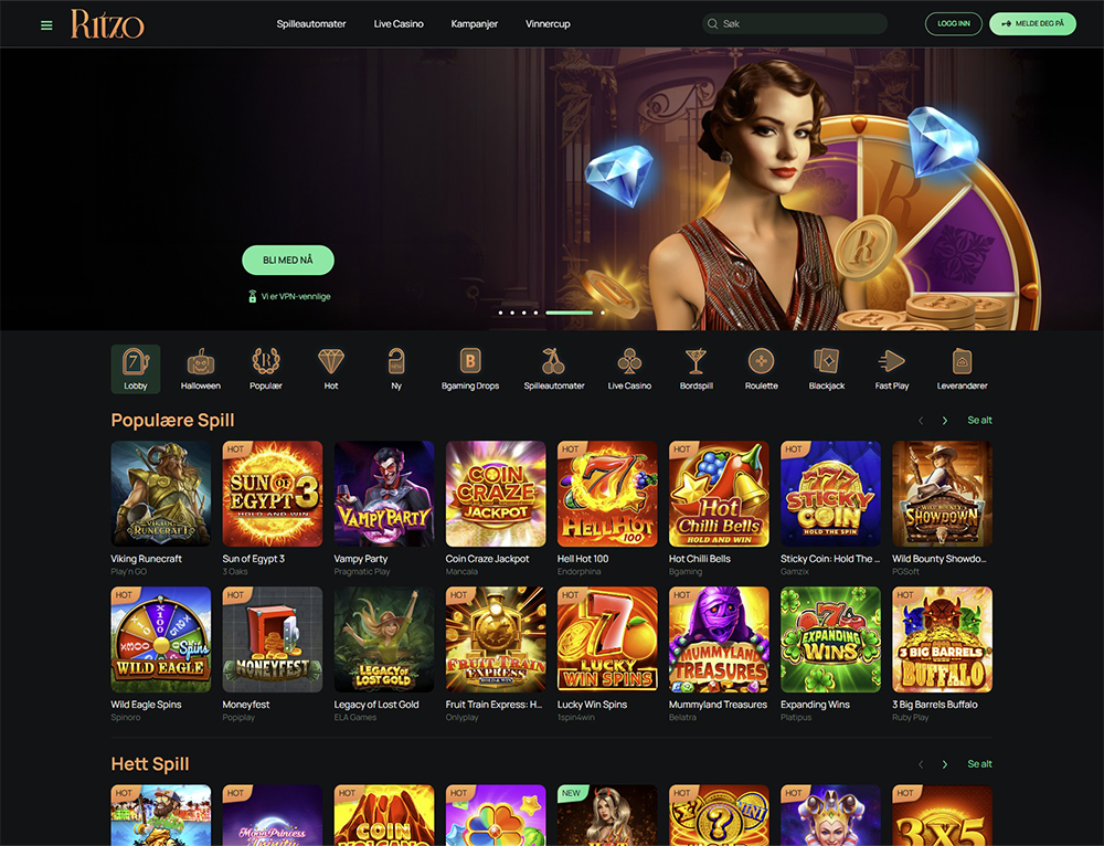 Ritzo casino er designet på en måte som oser av luksus – man skulle tro det bare var ment for de store spillerne. Det har en mørk bakgrunnsfarge med gull, bronse og varme metalliske høydepunkter som gir en følelse av klasse, eksklusivitet og rikdom. Spillene drives av verdensklasse programvareutviklere som Pragmatic Play – ikke rart at spilleautomater, bordspill og live-spill fungerer feilfritt.