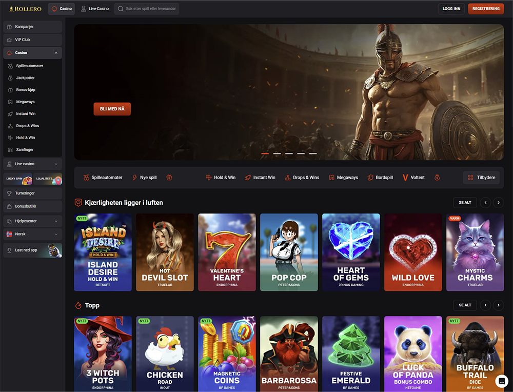 Rollero tilbyr et stort utvalg av spillmuligheter fra ledende spillutviklere som Pragmatic Play, Evolution og Play’n GO for å nevne noen. Her kan man velge blant over 9 000 spill fordelt på spilleautomater, bordspill og live casino. Et suverent utvalg for enhver casinospiller som ønsker et godt og variert spillutvalg!