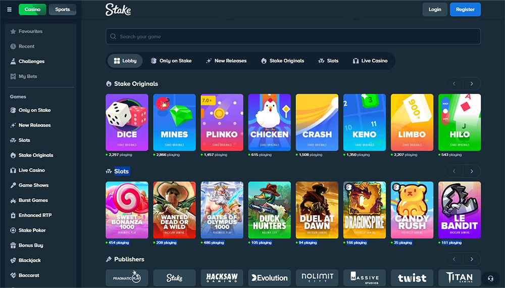 To av de mest brukte leverandørene hos Stake casino er Evolution og Pragmatic Play. De leverer spill med moderne grafikk, solid teknisk kvalitet og tydelige spillmekanikker. Variasjonen i bonusfunksjoner, toppgevinster og volatilitet gjør at både tilfeldige spillere og de som foretrekker høyere risiko finner spill som passer egne preferanser.