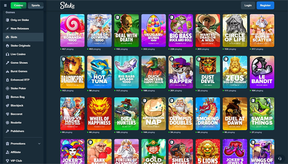 Stake har et casinoutvalg på over 4 000 titler, med slots, bordspill, Stake originals og live casino som hovedkategorier. Tilbudet inkluderer et moderne sportsbook for spillere som vil kombinere casinospill og odds. Utvalget gjør at nye og erfarne spillere finner noe som matcher egne preferanser.